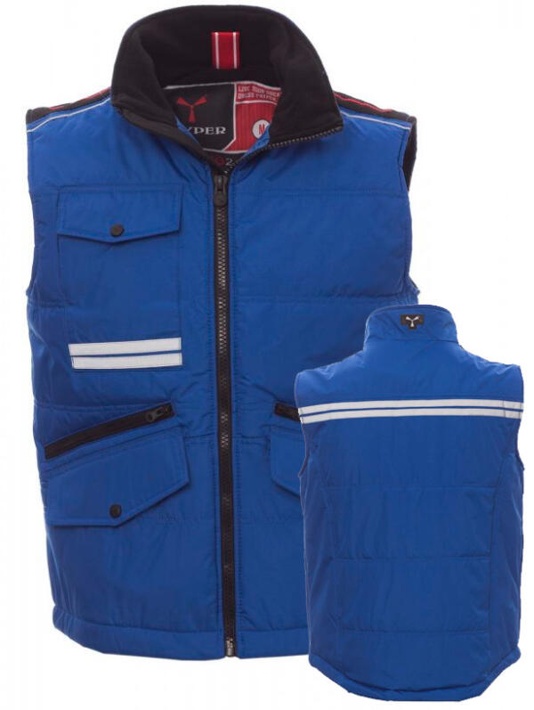 Chaleco unisex, cremallera de 8 mm de plástico con cursor de metal con tapeta y botones de plástico, parte posterior contorneada, dos bolsillos exteriores LOCK SYSTEM y dos bolsillos con cremallera, bolsillos sesgados para fácil acceso, un bolsillo a la altura del pecho para smartphone y anilla de soporte para tarjeta de identificación, bandas reflectantes en el bolsillo y en la parte trasera. Interior: acolchado, forro polar de contraste en espalda y cuello, un bolsillo, cremallera interior para facilitar la impresión y el bordado.