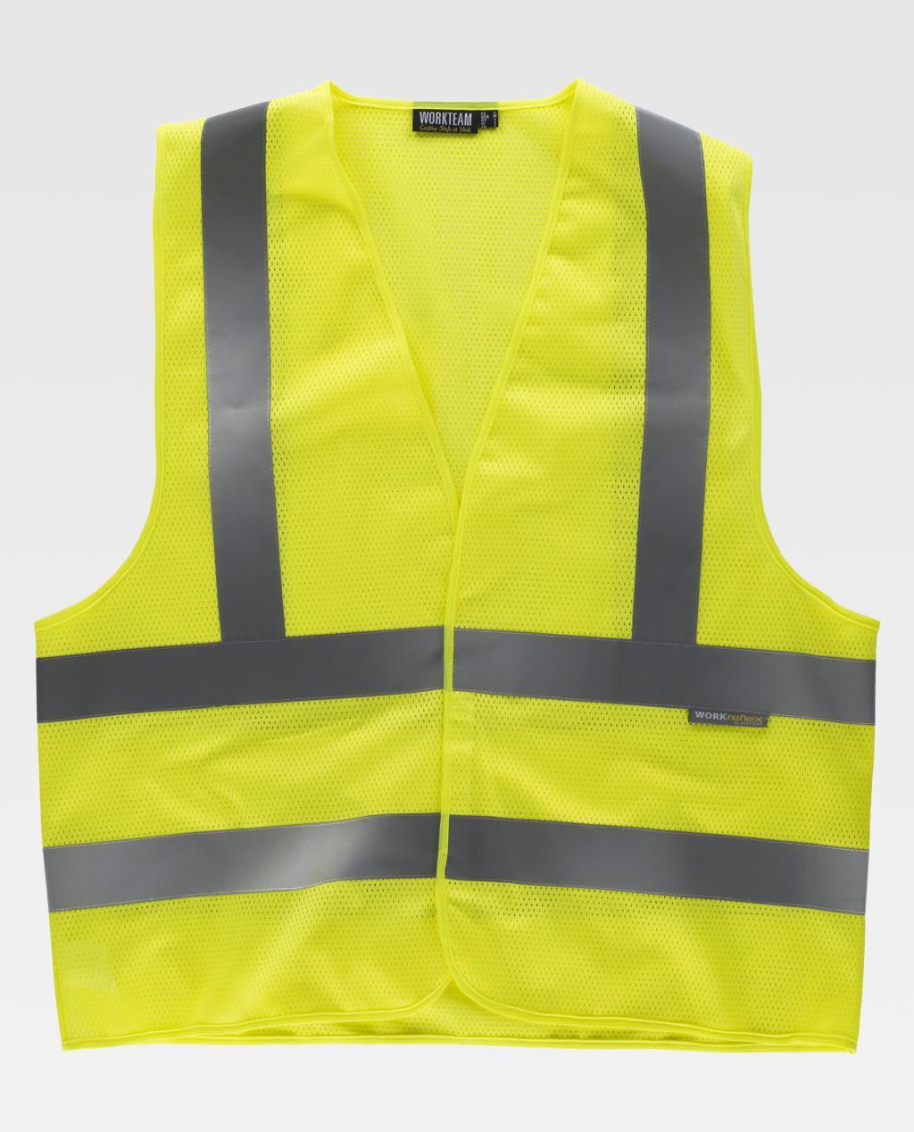 Chaleco en rejilla de alta visibilidad con cintas reflectantes. Escote a pico y cierre de velcro adaptable. Una cinta reflectante en hombros y dos en pecho y espalda. Ribeteado con bies.