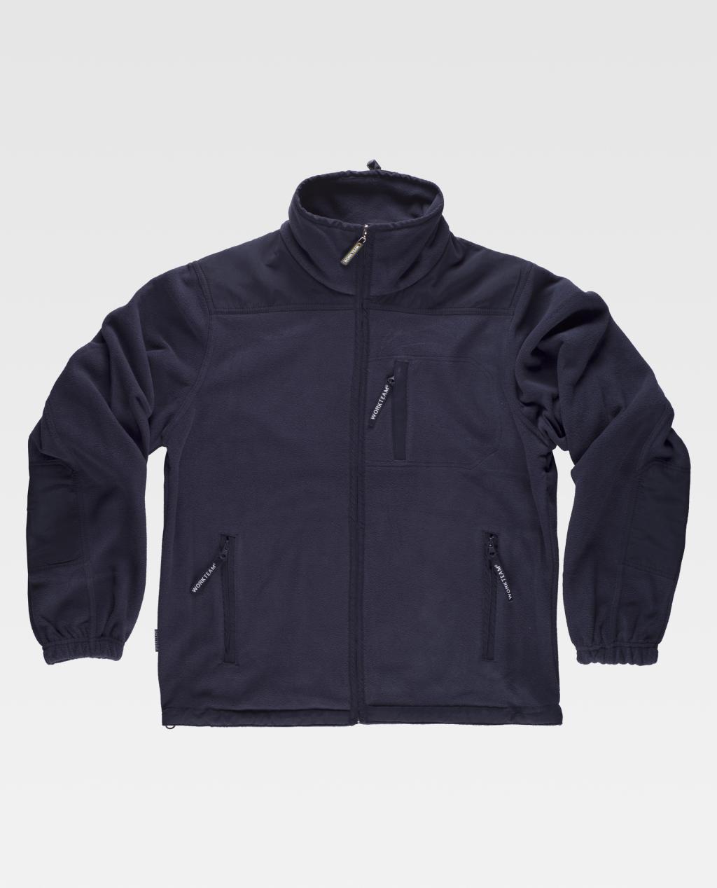 Chaqueta polar combinada con tejido de tacto melocotón en canesús y coderas. Cuello alto ajustable y cierre de cremallera de nylon. Un bolso de pecho y dos bolsos laterales interiores con cremalleras de nylon. Ribeteado con bies. Puño con elástico. Cordón elástico con pieza ajustable en cuello y cintura.