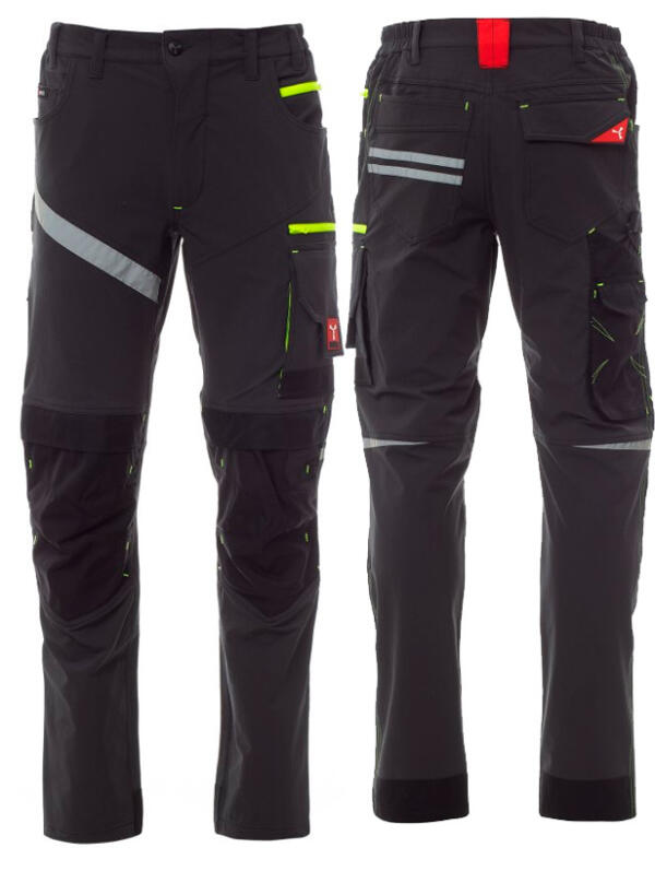 Pantalón unisex elástico para todo el año, con elásticos laterales y trabillas en la cintura, cierre con cremallera y botón personalizado. En el delantero tiene dos bolsillos perfilados, un bolsillo pequeño para monedas a la derecha y un bolsillo pequeño de seguridad cerrado con cremallera a la izquierda. En la parte delantera de la pernera izquierda presenta un bolsillo con fuelle, tapeta cerrada con velcro y soporte para tarjeta de identificación. En la parte delantera de la pernera derecha presenta un bolsillo para el teléfono móvil con borde retrorreflectante y un bolsillo con fuelle. Ambas perneras disponen de bolsillos para rodilleras en Nylon Oxford 500D de tejido en contraste (con apertura por la parte inferior) y de aplicaciones retrorreflectantes que indican la apertura. En la parte trasera presenta un bolsillo con tapeta cerrado con velcro, un bolsillo sin tapeta pero con 2 bandas retrorreflectantes, un bolsillo para el metro (pernera derecha), aplicaciones retrorreflectantes a la altura de la rodilla (ambas perneras) y cinta talonera de tejido en contrate (ambas perneras). También presenta: – costuras de triple aguja en la entrepierna y en el interior y exterior de la pernera – costuras de refuerzo en contraste en distintos puntos. En las tallas (italianas) centrales 48-50-52, el interior de la pernera tiene una longitud normal de 82 cm.