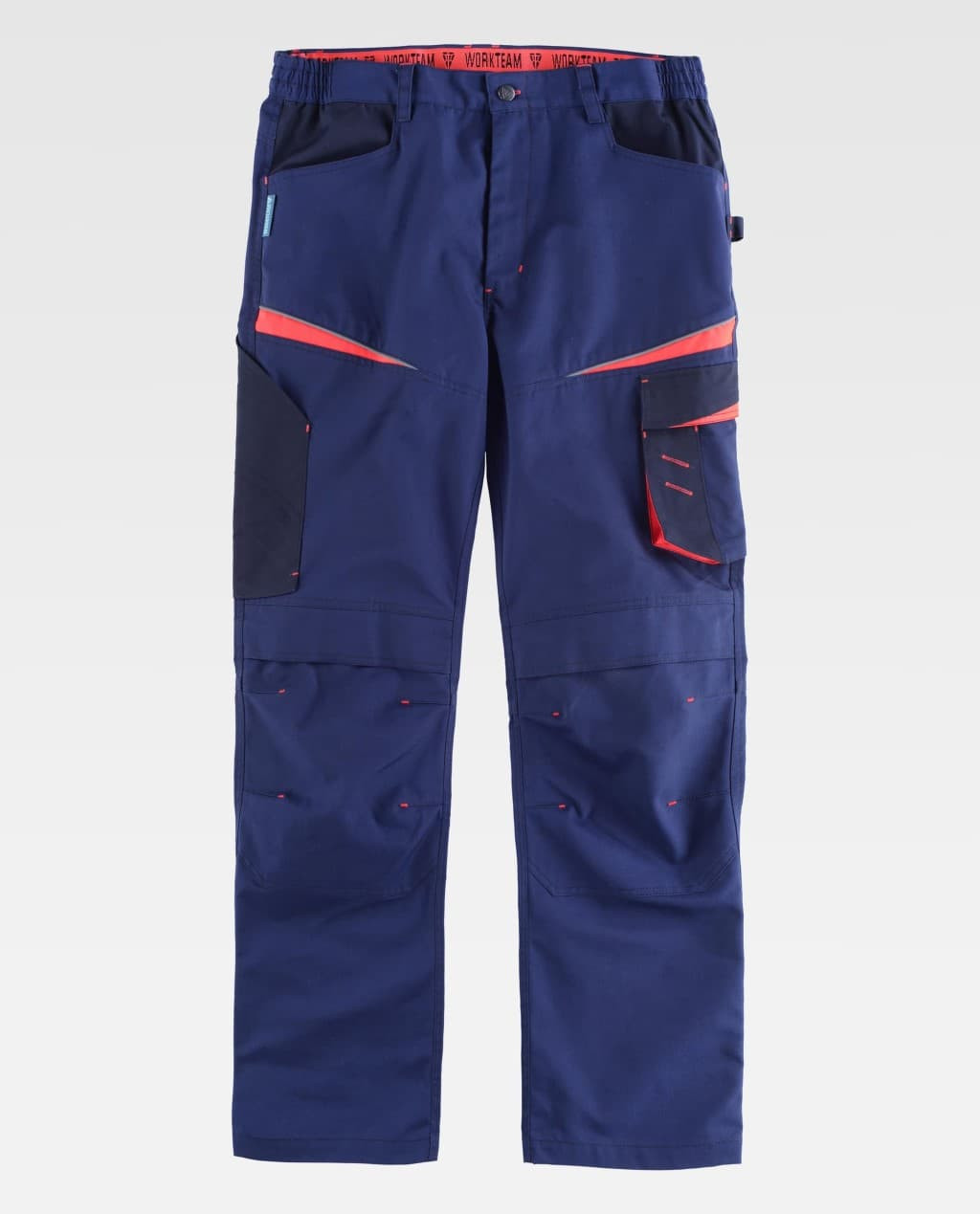 Pantalón tricolor con tejido canvas. Dos bolsos de abertura inclinada en los costados. Un bolso lateral de espátula y otro de carga con cartera de velcro y otro superpuesto para bolígrafos. Dos bolsos traseros con fuelle y cartera de velcro. Trabilla porta martillo. Refuerzo con cierre de velcro para rodilleras de protección. Vivos reflectantes y presillas a contraste. Elástico en los laterales de la cintura. Trabillas. Cierre de botón metálico y bragueta de cremallera.