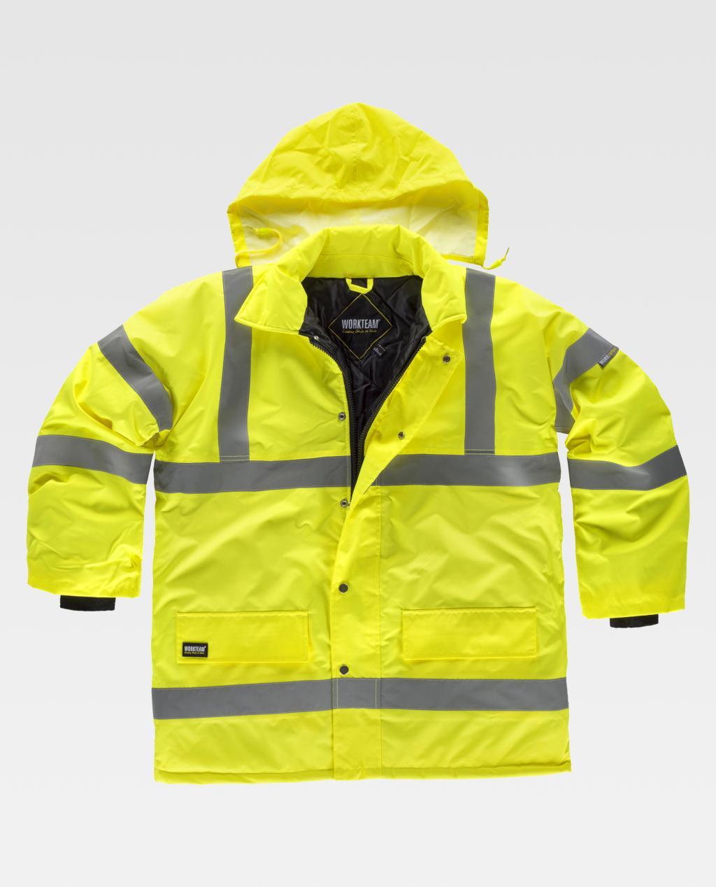 Parka acolchada e impermeable en tejido Oxford, de alta visibilidad y con cintas reflectantes. Cuello camisero con capucha interior ajustable con cordón. Cierre de cremallera de doble tirador oculta por solapa postiza con corchetes. Dos bolsos laterales de ojal con cartera. Un bolso de pecho de plastón en el interior. Una cinta reflectante en hombros y dos en pecho, espalda y mangas. Puño elástico en el interior de la manga.